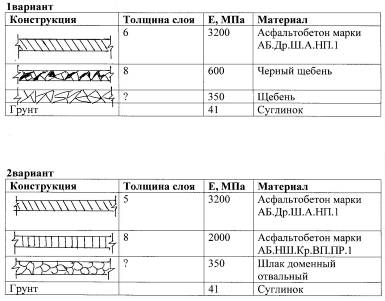 Так как проектная линия поднята значительно выше, чем требует предполагаемое усиление дорожной одежды, объёмы новой дорожной одежды будут значительно больше; поэтому расчёт дорожной одежды начинаем с конструкции новой дорожной одежды. При конструировании вариантов дорожной одежды необходимо пользоваться принципом, что конструкция дорожной одежды в целом должна удовлетворять транспортно-эксплуатационным условиям дороги данной категории. В соответствии с исходными данными, расчетной приведённой интенсивности движения и требуемым модулем упругости принимаем два варианта дорожной одежды: