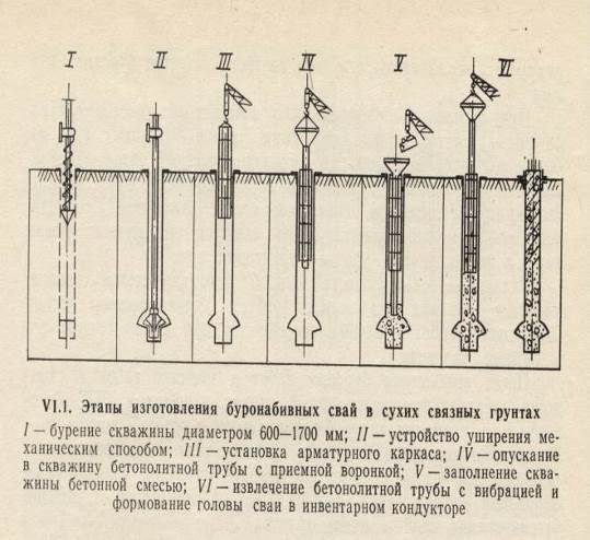 В наиболее сложных и ответственных случаях скважины бетонируют методом восходящего раствора или комбинированным, заполняя методом восходящего раствора нижнюю часть скважины ниже уровня грунтовых вод, а верхнюю – методом вертикально – перемещающейся трубы. При этом трубу для подачи раствора при бетонировании методом восходящего раствора помещают в бетонолитную трубу и извлекают при переходе на бетонирование методом вертикально – перемещающейся трубы. Специальная система гидродомкратов, смонтированных на буровом станке, сообщает колонне обсадных труб возвратно – поступательное и вращательное движения, тем самым дополнительное уплотняя бетонную смесь. При отсутствии воды в скважине и длине свай до 10 м в отдельных случаях бетонирование выполняют свободным сбросом бетонной смеси в скважину. По окончании бетонирования скважины формируют головы свай. Буронабивные сваи по описанной технологии изготавливают диаметрами 880 – 1200 мм, длиной до 35 м.